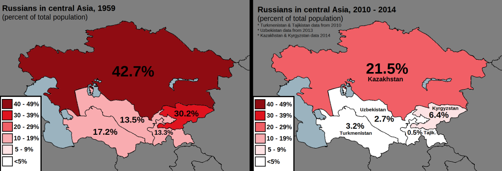 Most present-day PSCA territories fell under Russian colonial rule only in the 19th century and underwent intensive demographic colonization in the 20th century. The peak occurred during the Stalin era, when in several republics or their regions Russian-speakers comprised one-third to one-half of the population — or even a majority, as in northern Kazakhstan.