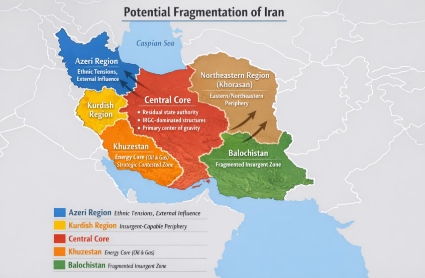 It is important to note that in such cases one is not dealing with a “division of empire” along the lines of the former USSR or Yugoslavia—where dissolution followed pre-existing administrative borders—but rather with a Syrian-type scenario, involving the emergence of zones of control held by different actors in a civil and insurgent conflict. In the case of Iran, such a scenario could result in the formation of several such zones: